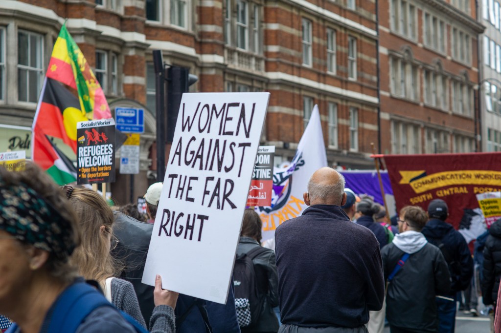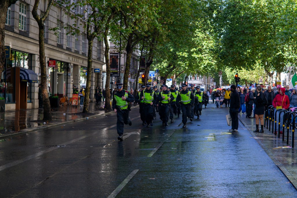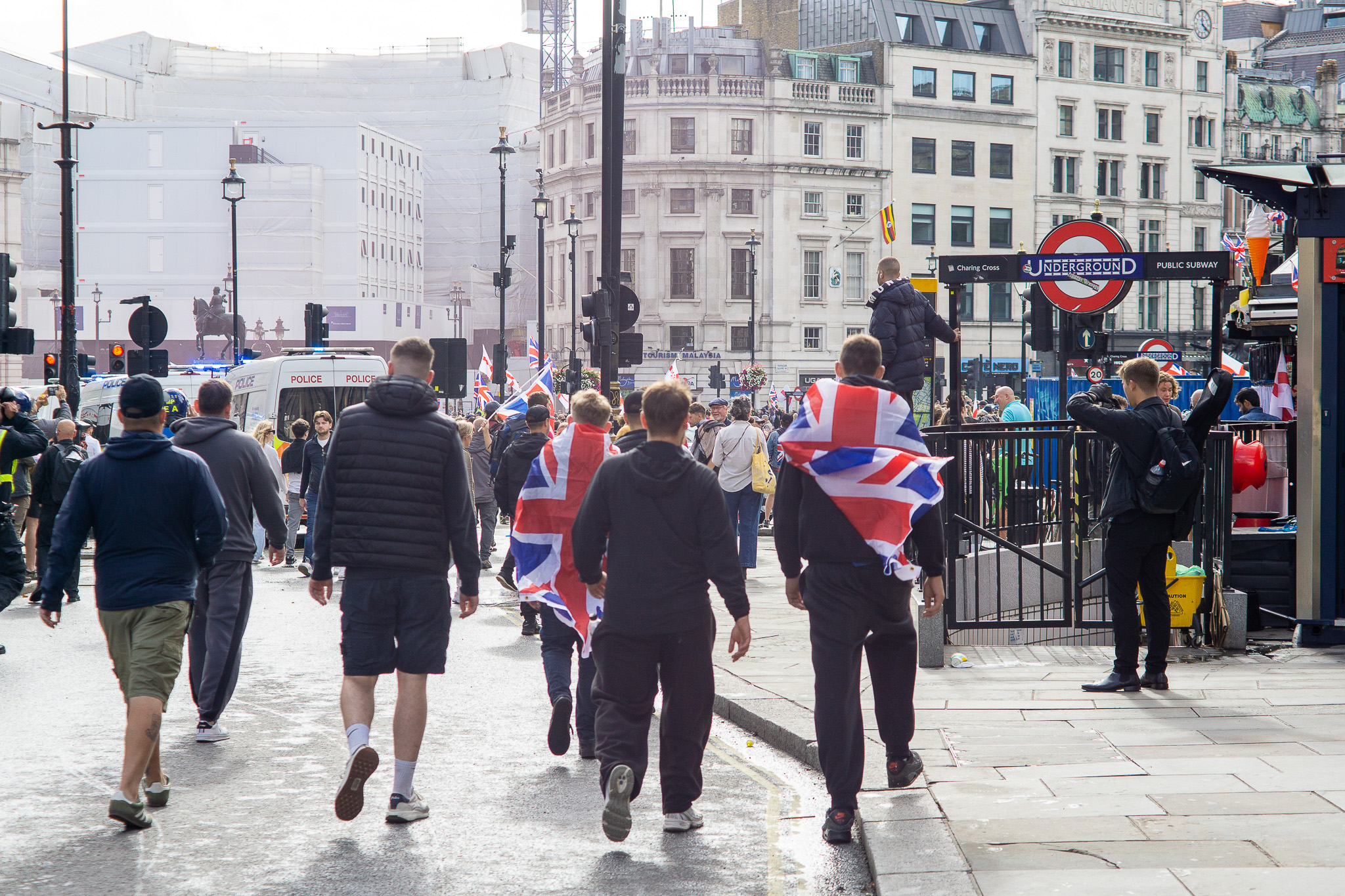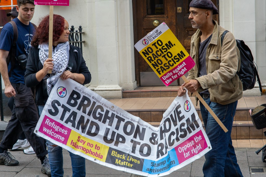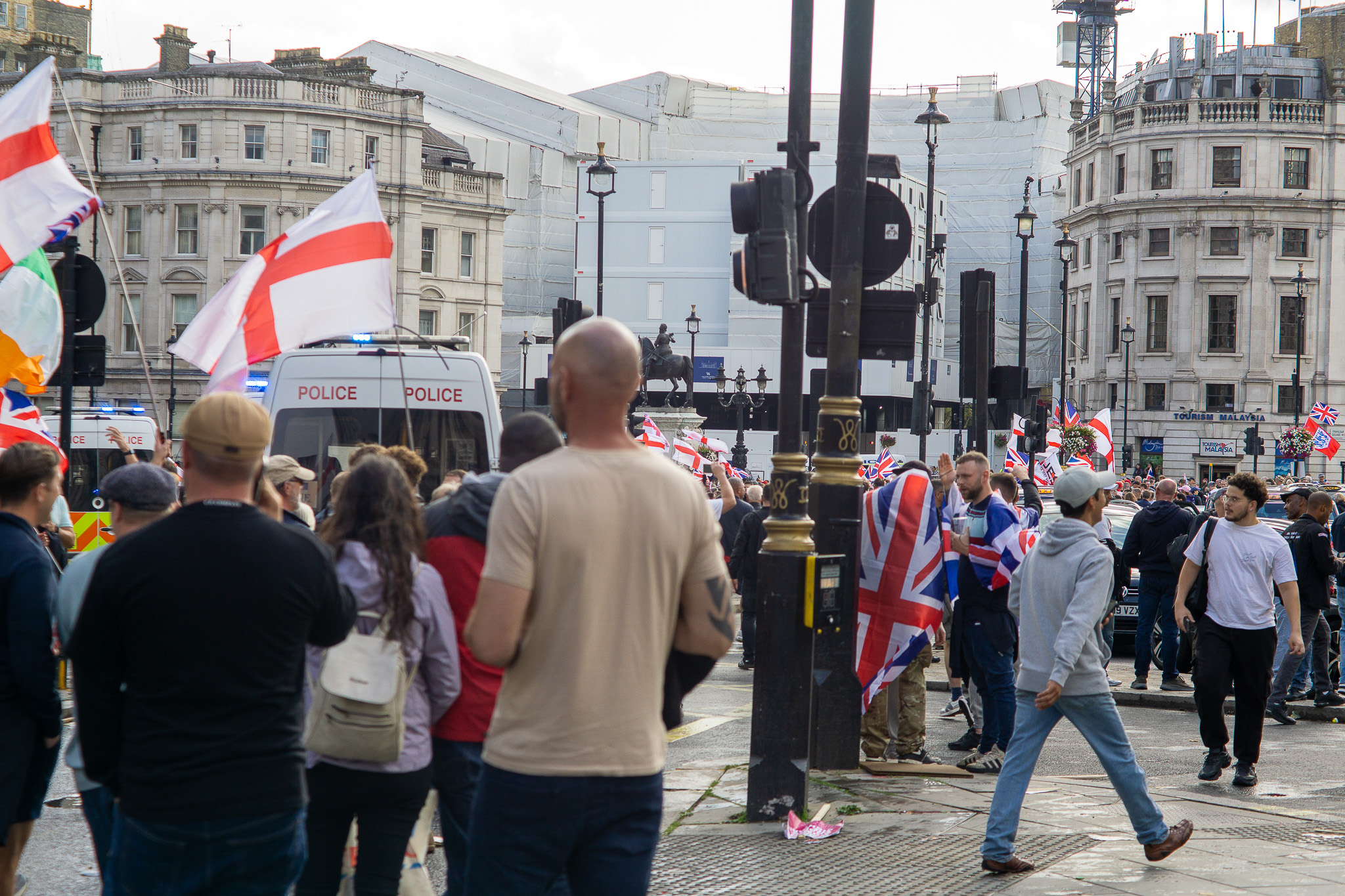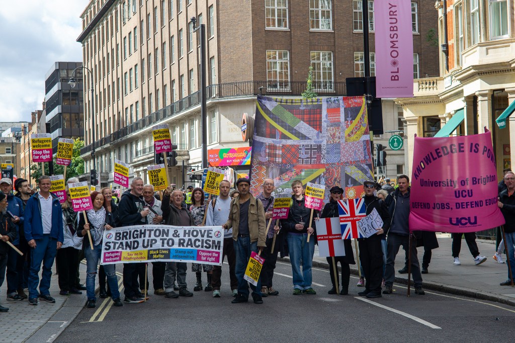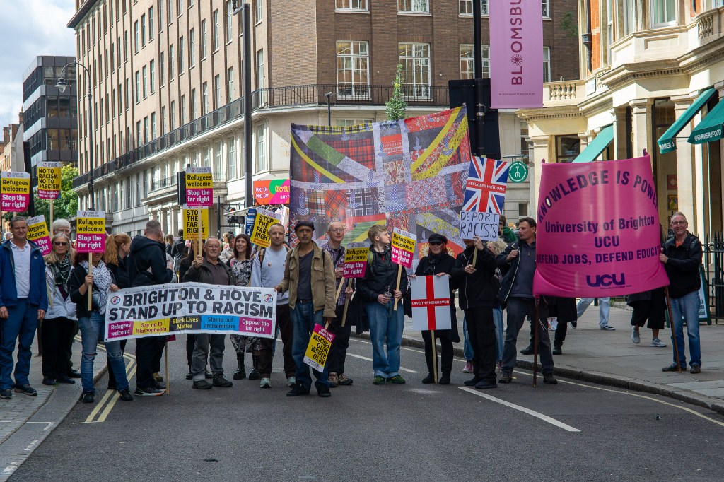 In Trafalgar Square, the Met Police, failed to keep the far right protests away from the counter protest. The far right, which consisted mostly of white men, many of who were drunk, behaved aggressively, shouted abuse, sometimes racist and threatened people on the anti racism demonstration. One man tried to pull my scarf off. They chanted ‘paedo’, ‘traitor’ and ‘leftie scum’. The far right, greatly outnumbered the counter protest, which is deeply worrying. The counter protest was led by the women’s bloc, and of course was diverse in many ways and peaceful. The Brighton Stand Up Racism group travelled up on the train together. The counter protest was meant to finish with speeches in Whitehall, but due to the number of far right and poor police management, many were unable to reach the designated area. The police kettled the SUTR into Whitehall, blocking the entrance, which meant many were stuck in Trafalgar Square, with the far right.