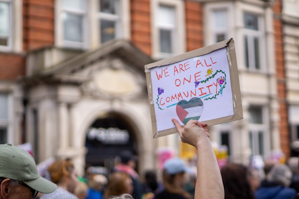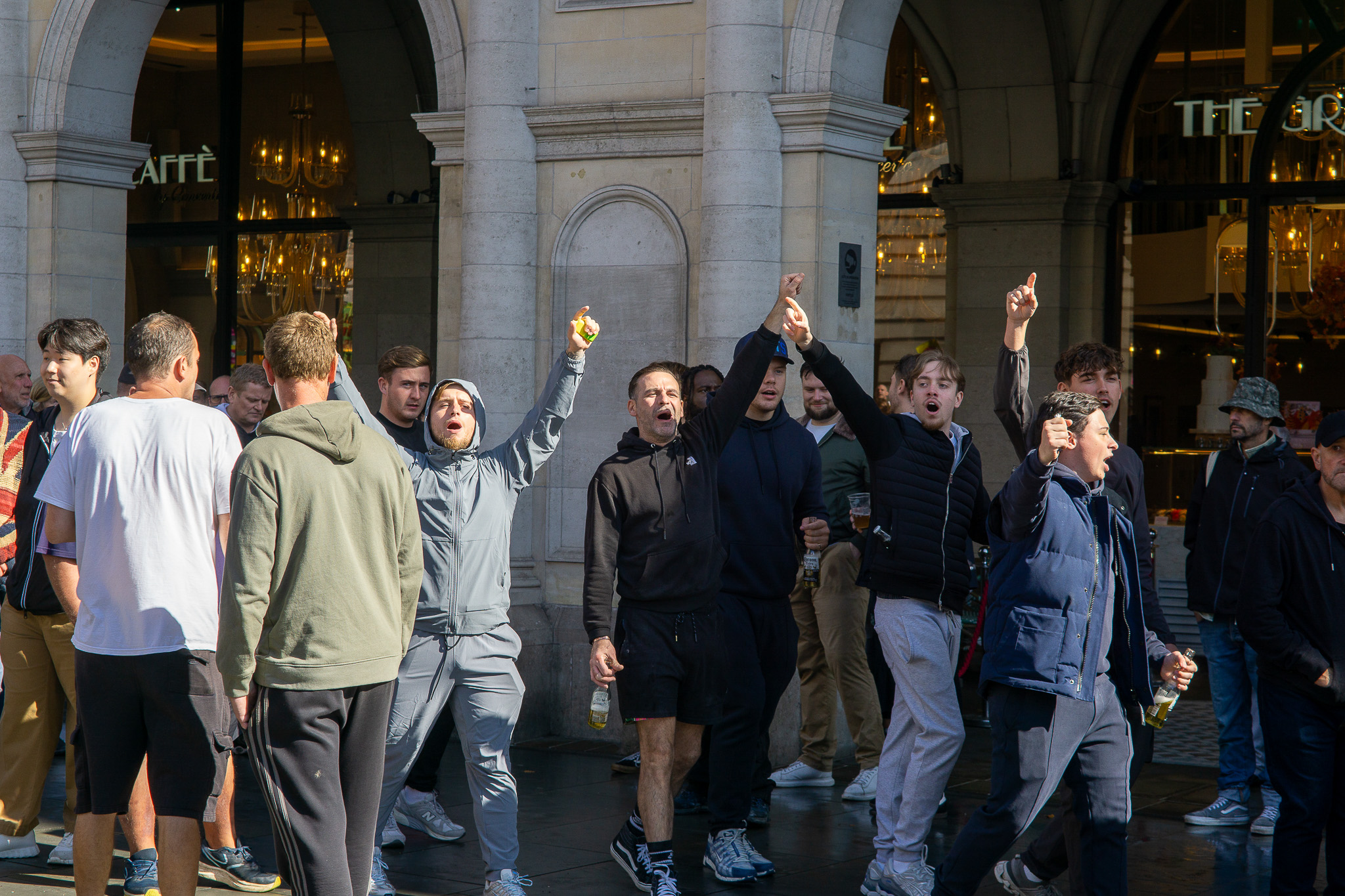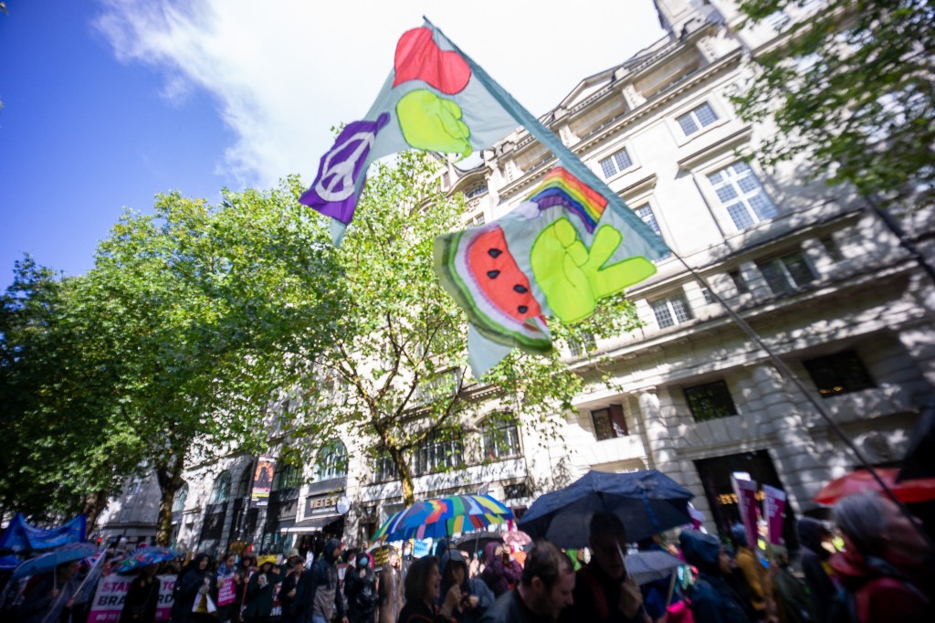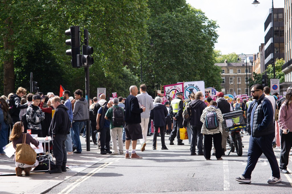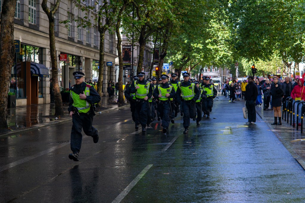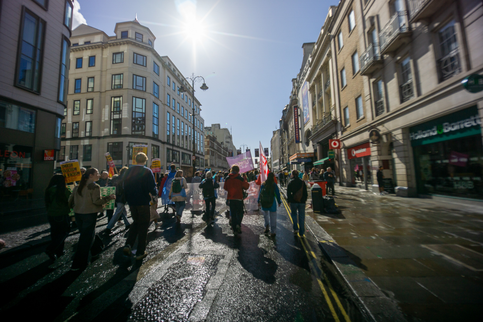 In Trafalgar Square, the Met Police, failed to keep the far right protests away from the counter protest. The far right, which consisted mostly of white men, many of who were drunk, behaved aggressively, shouted abuse, sometimes racist and threatened people on the anti racism demonstration. One man tried to pull my scarf off. They chanted ‘paedo’, ‘traitor’ and ‘leftie scum’. The far right, greatly outnumbered the counter protest, which is deeply worrying. The counter protest was led by the women’s bloc, and of course was diverse in many ways and peaceful. The Brighton Stand Up Racism group travelled up on the train together. The counter protest was meant to finish with speeches in Whitehall, but due to the number of far right and poor police management, many were unable to reach the designated area. The police kettled the SUTR into Whitehall, blocking the entrance, which meant many were stuck in Trafalgar Square, with the far right.