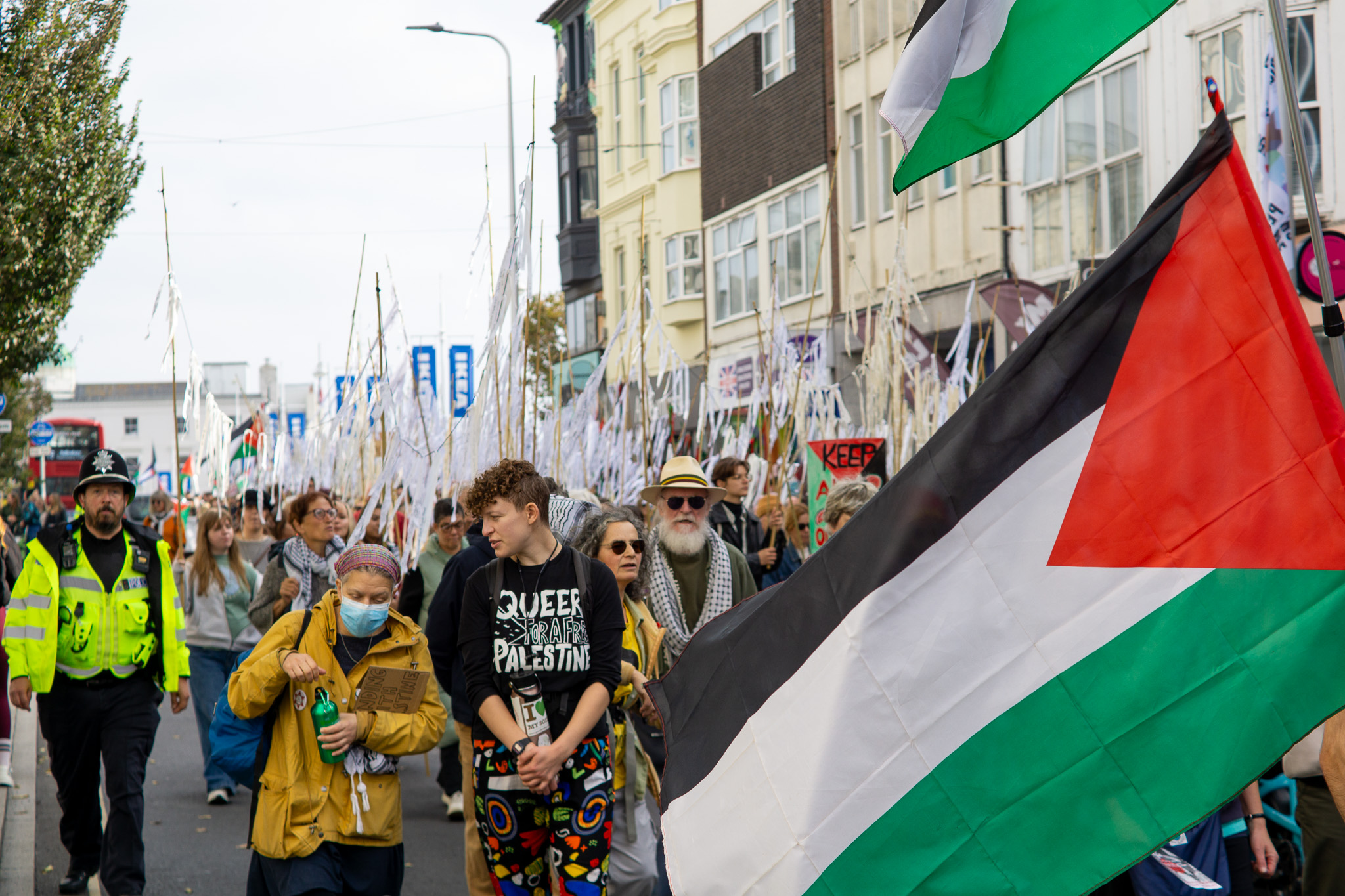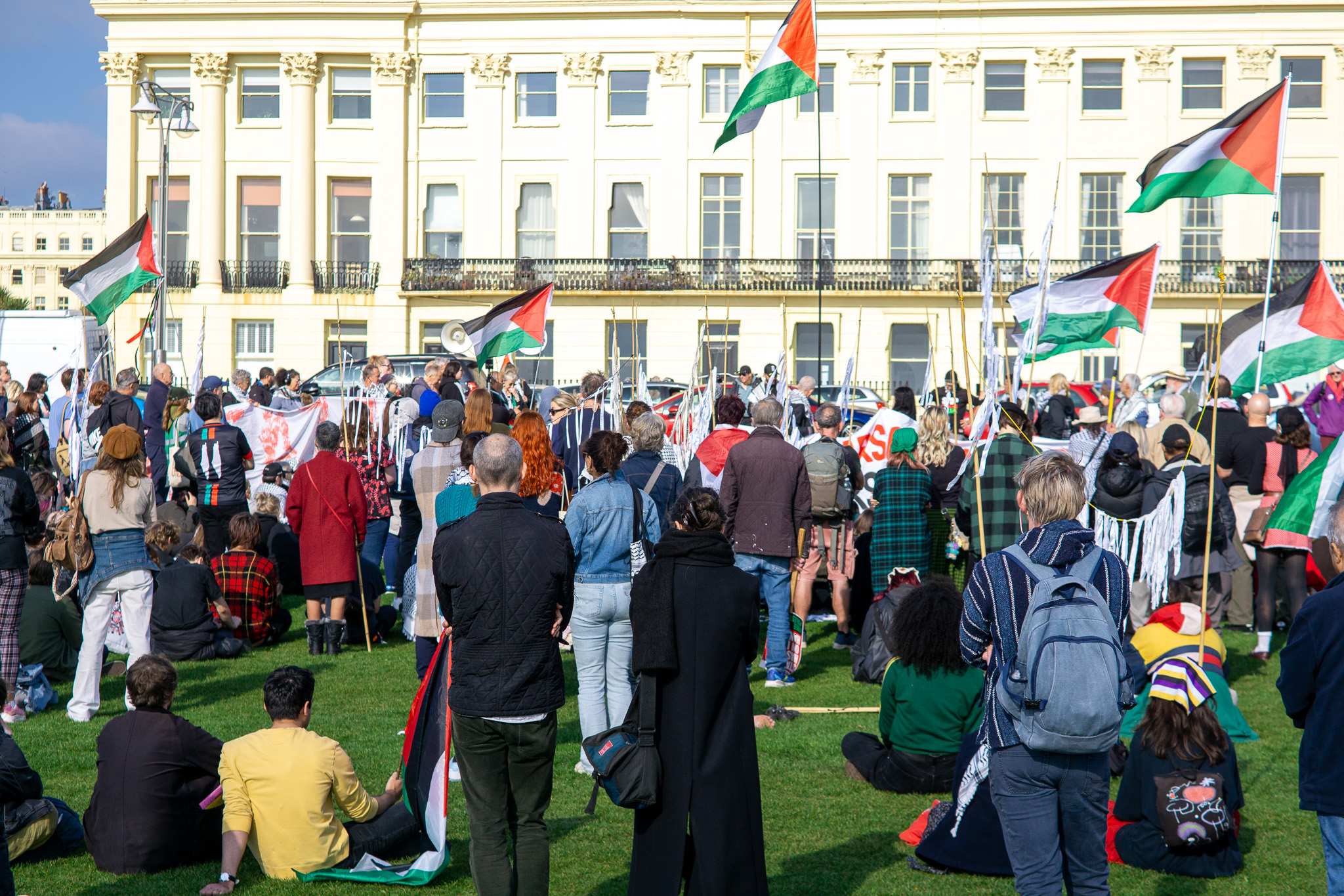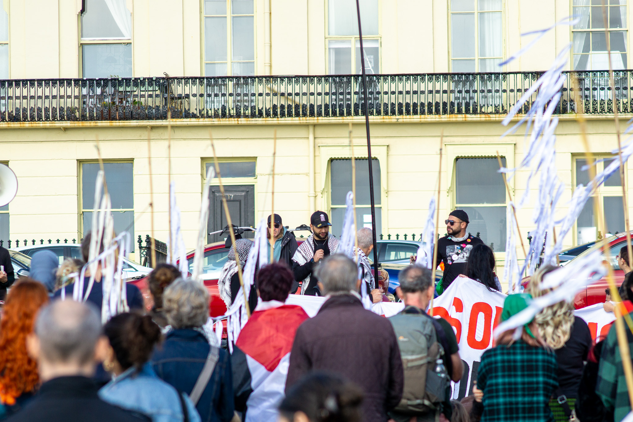 The last image in this gallery is Heidi Bachram. She stood behind the crowd at the end of the march, during speeches, filming the whole time. She then complained when someone filmed her. Heidi is connected to Sussex Friends of Israel, who have been responsible for the harassment of Jewish people speaking up for Palestine, as well as targeting Palestinian voices and cultural events, including people who are refugee’s for being involved with Palestinian artists.