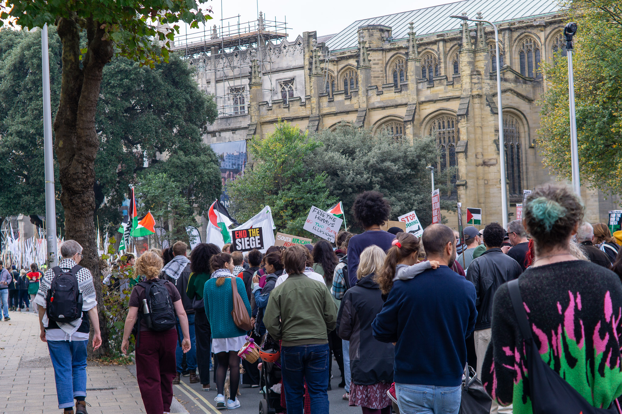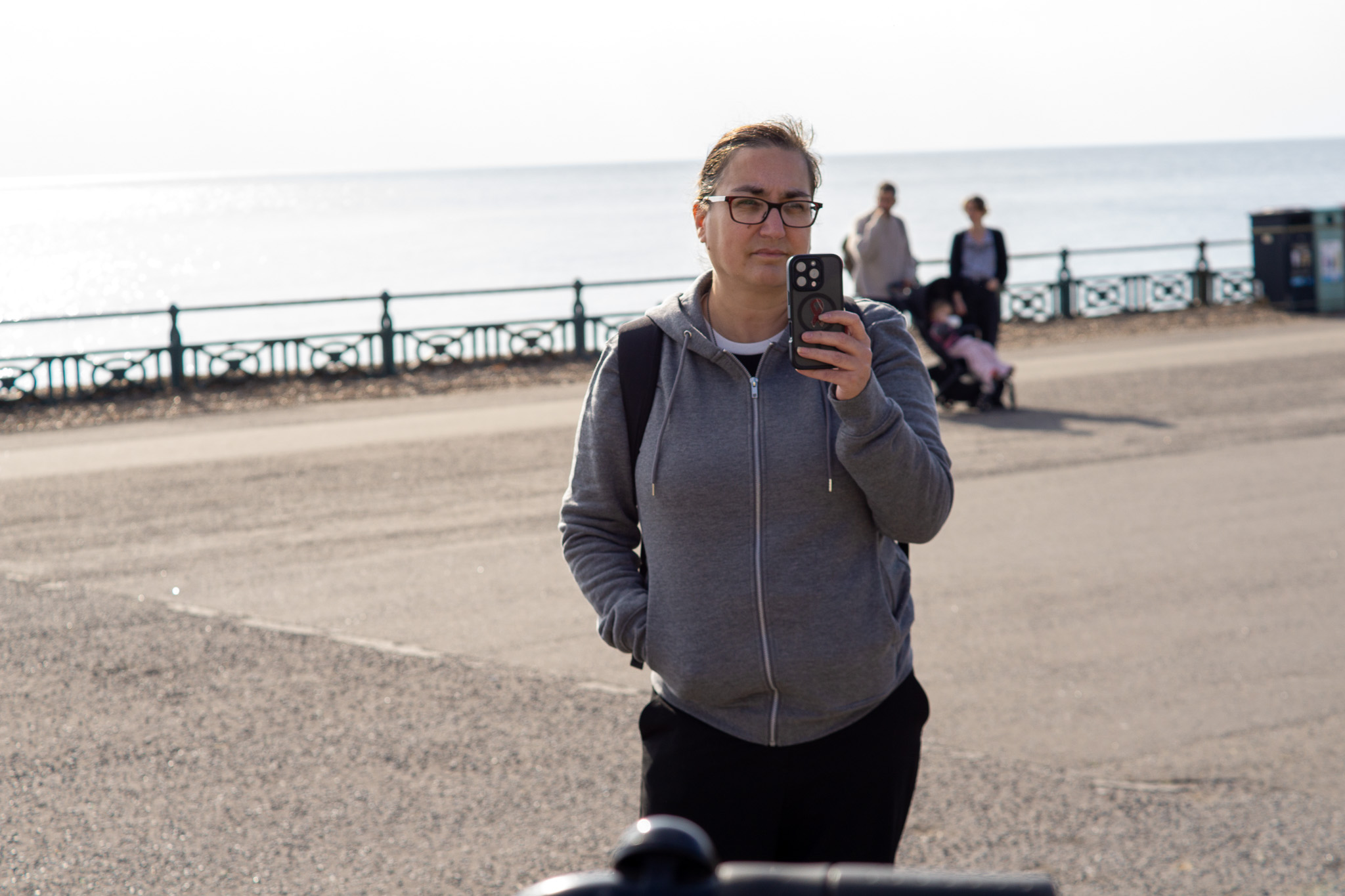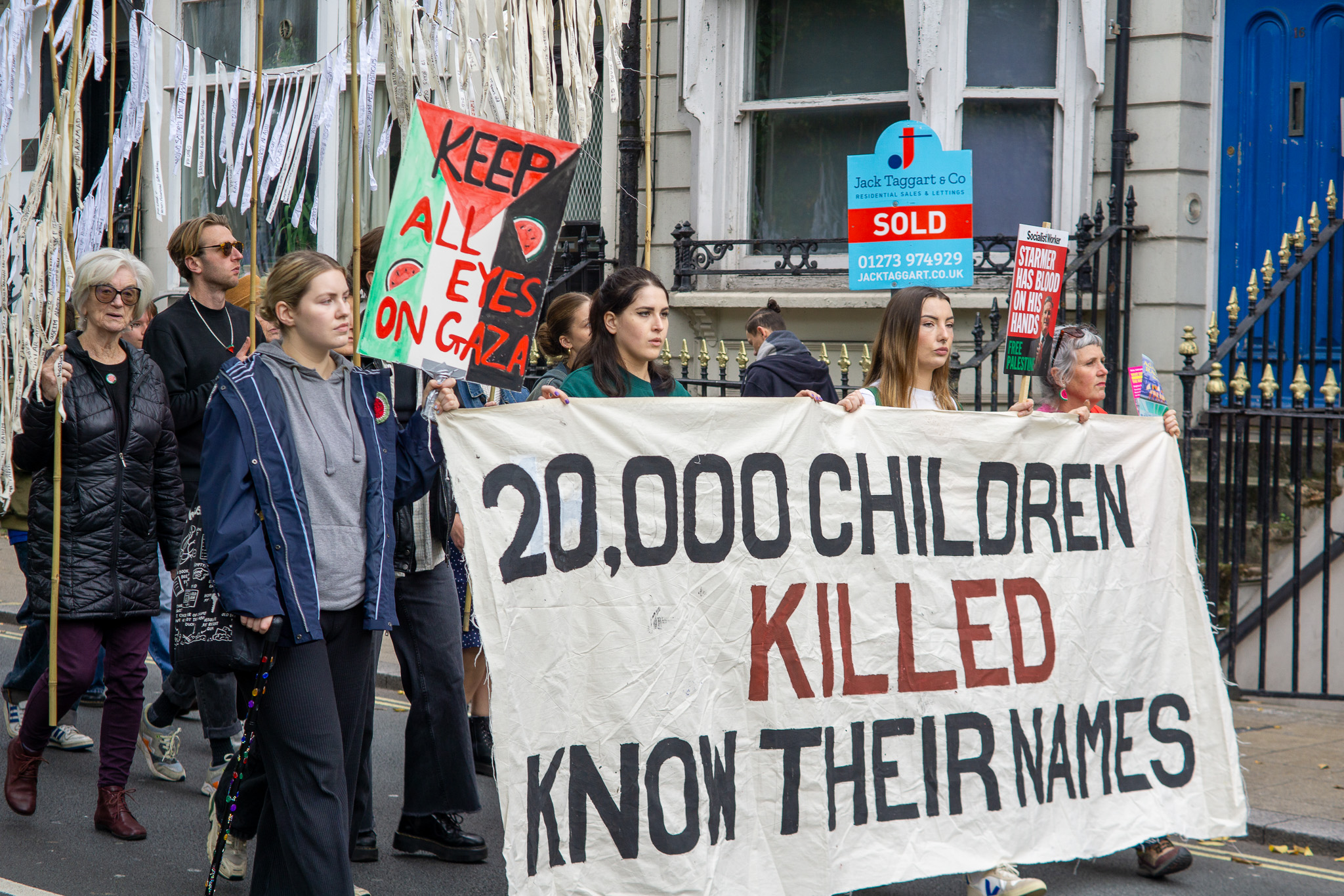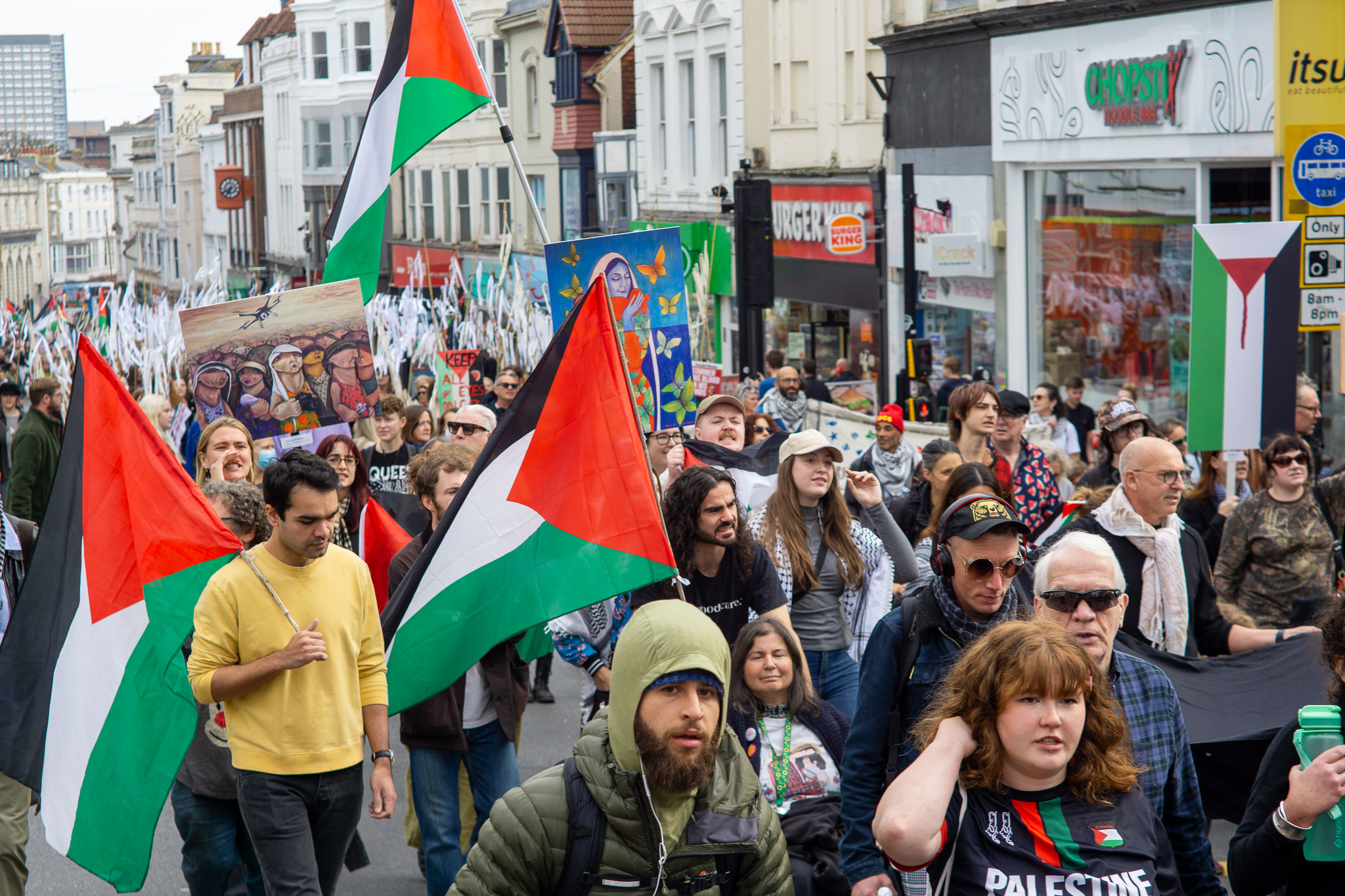 The last image in this gallery is Heidi Bachram. She stood behind the crowd at the end of the march, during speeches, filming the whole time. She then complained when someone filmed her. Heidi is connected to Sussex Friends of Israel, who have been responsible for the harassment of Jewish people speaking up for Palestine, as well as targeting Palestinian voices and cultural events, including people who are refugee’s for being involved with Palestinian artists.