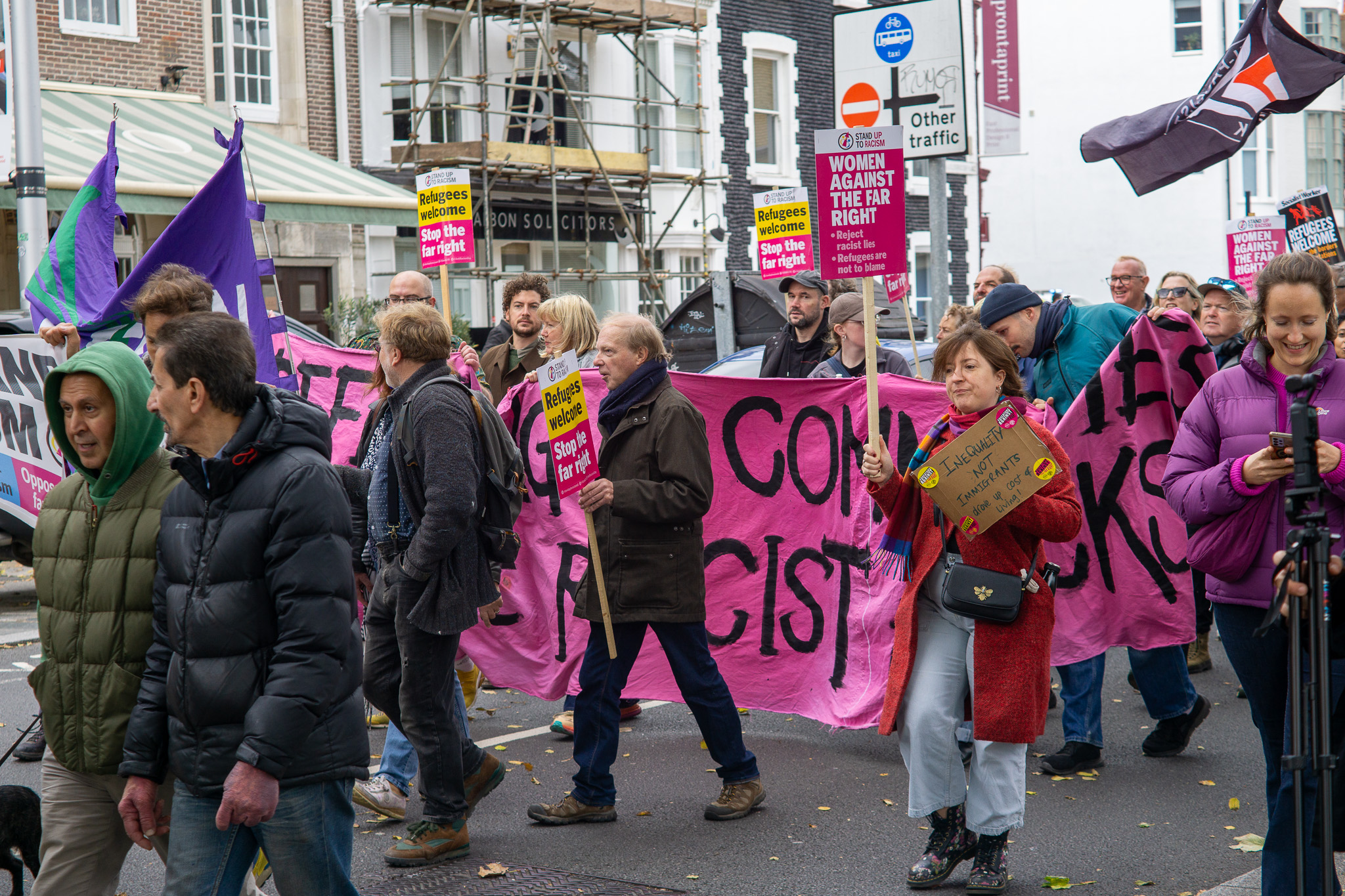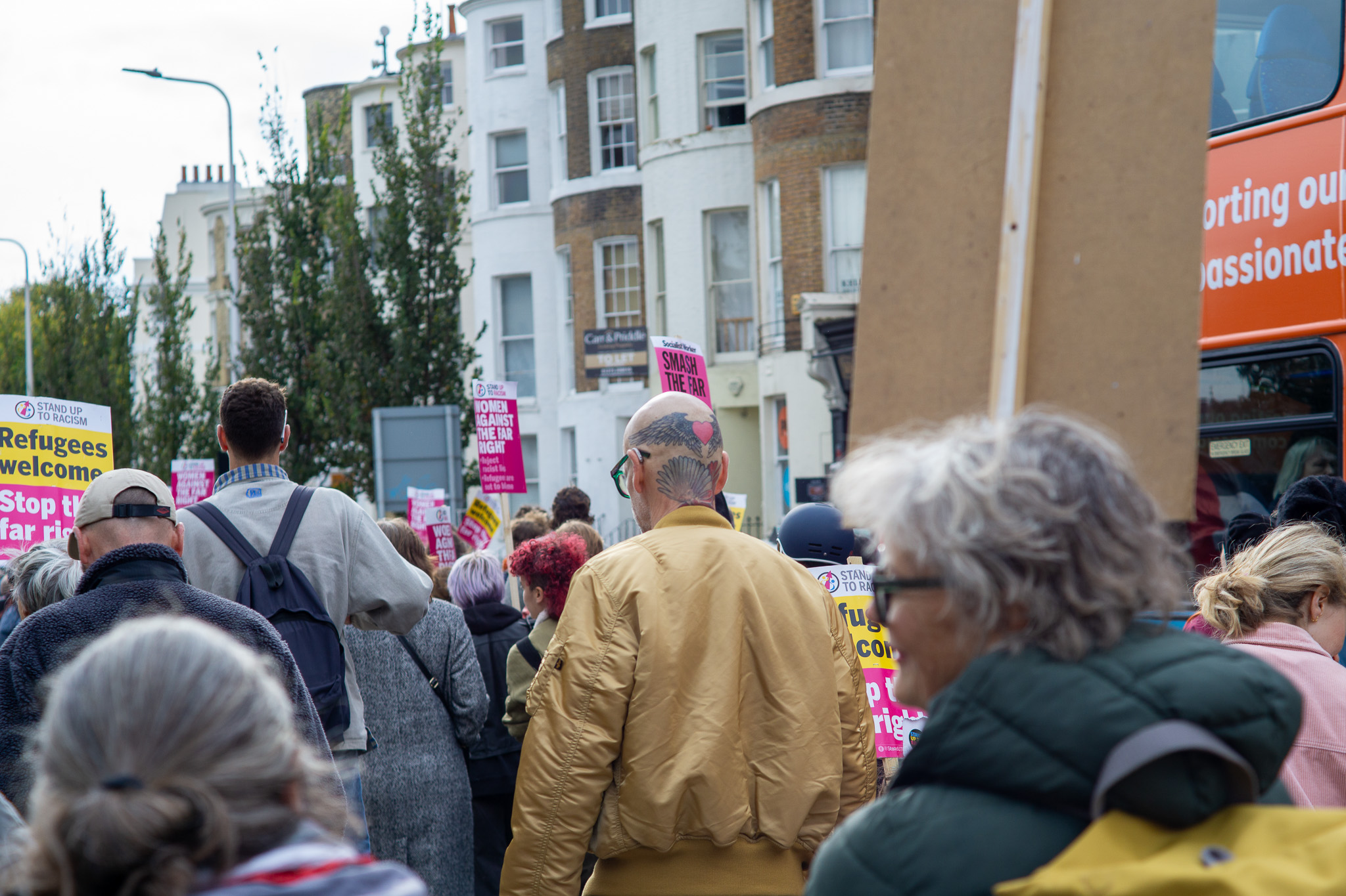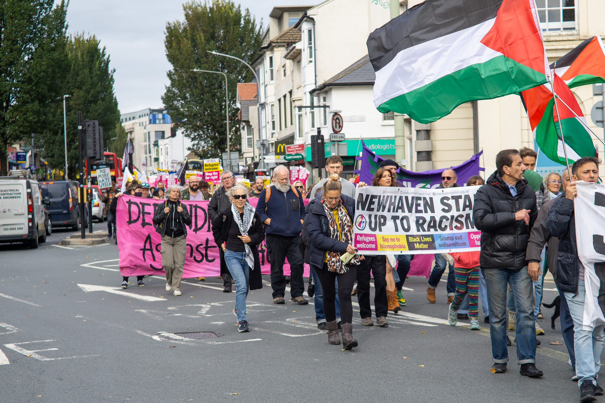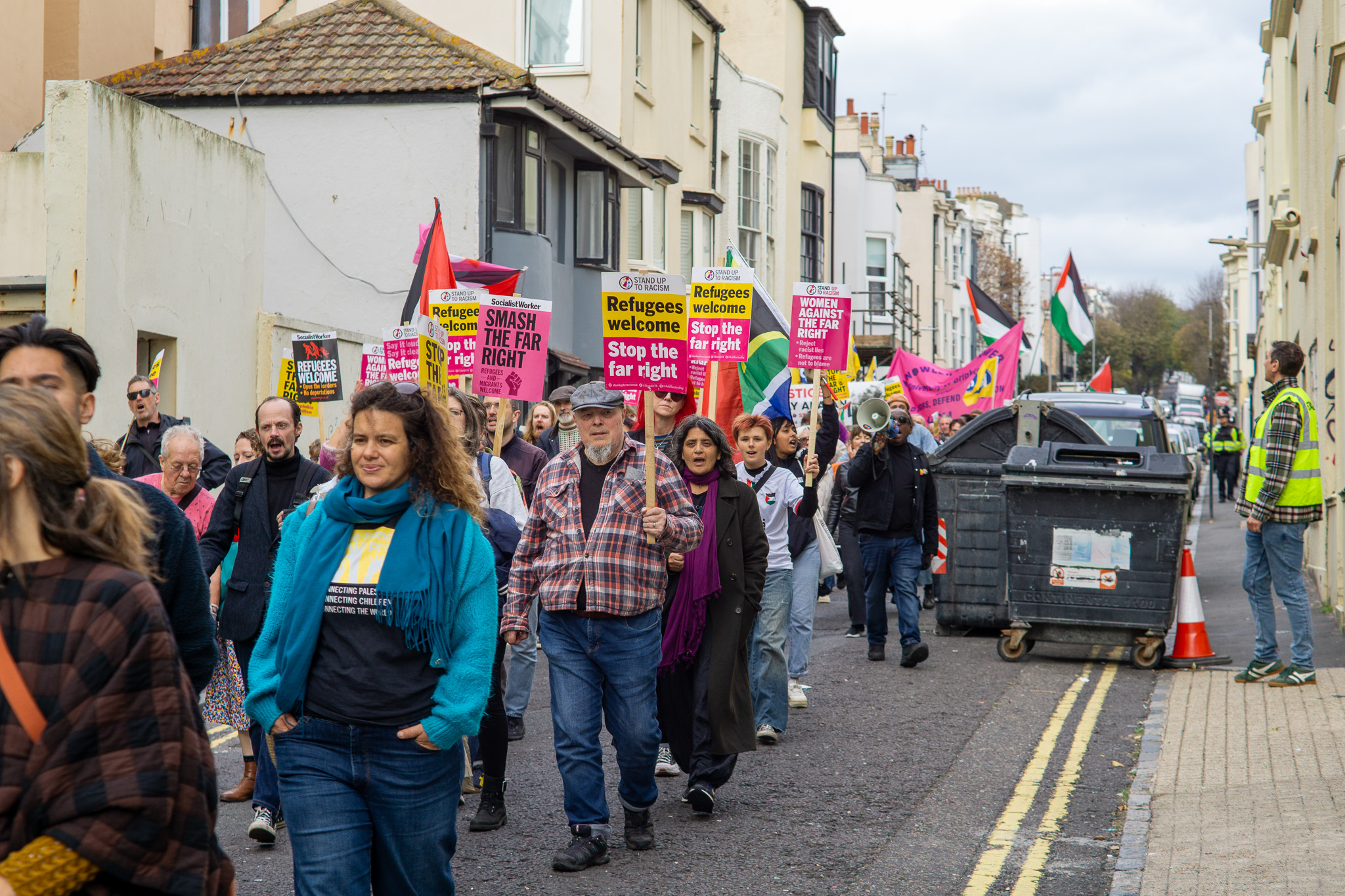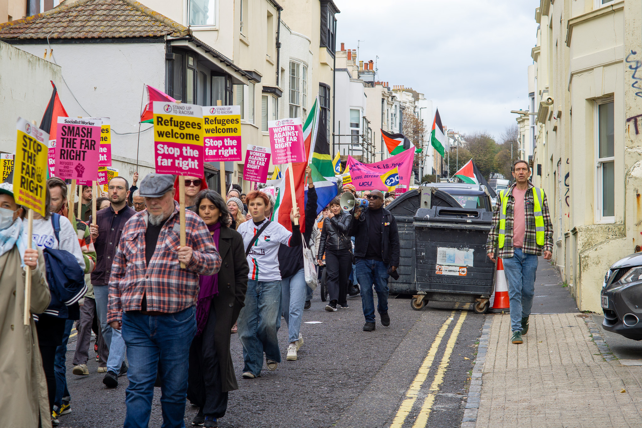 18th October, around 500 to 600 people marched through Brighton, to protest increasing racism in society. As we passed through Brighton, many were supportive. Early on in the demo, on London road, one guy at the side of the road became abusive, the police asked him to calm down, and he started a fight with them, at which point around 5 of them arrested him. After the march, we went to a cafe in Hove. Initially, upon seeing Laila’s placard the woman behind the counter was frosty with us. She asked us if we’d been on a demo. Yes, and anti racism one. Are you supportive of Palestine she asked, yes..I showed her my jumper. She immediately opened up, explaining that a bunch of pro Israel demonstrators had just been in. They’d made racist comments about Muslims, adding that she would be forced to wear a Burka. She refused to serve them and asked them to leave. When she described what they looked like, it was clear she was talking about some of Sussex Friends of Israel, who’s recent antics have included shouting in the street at Jewish people who support Palestine, and generally harassing anyone who stands agains the genocide. We ended up having a nice chat about music, and some tasty snacks.