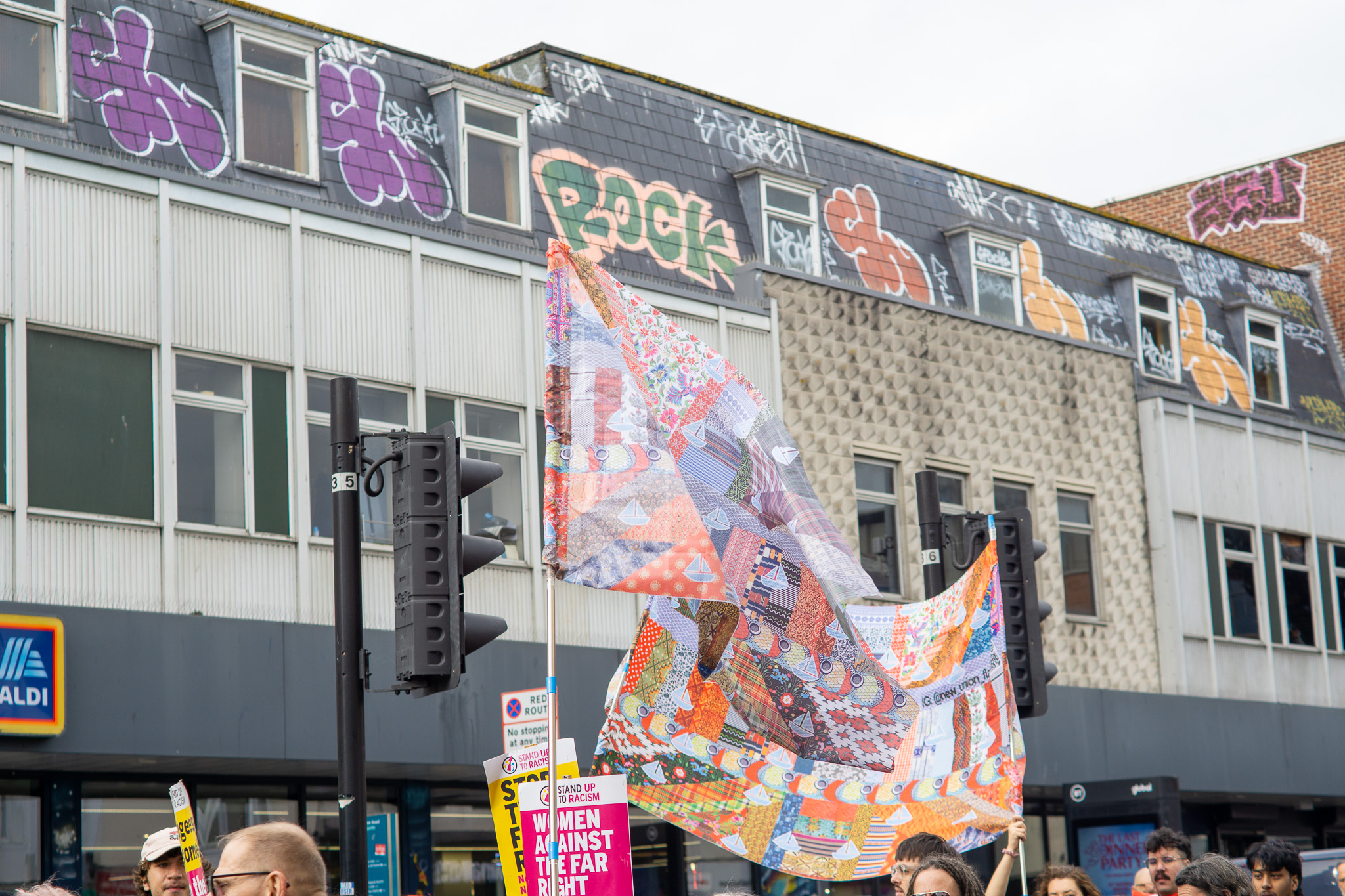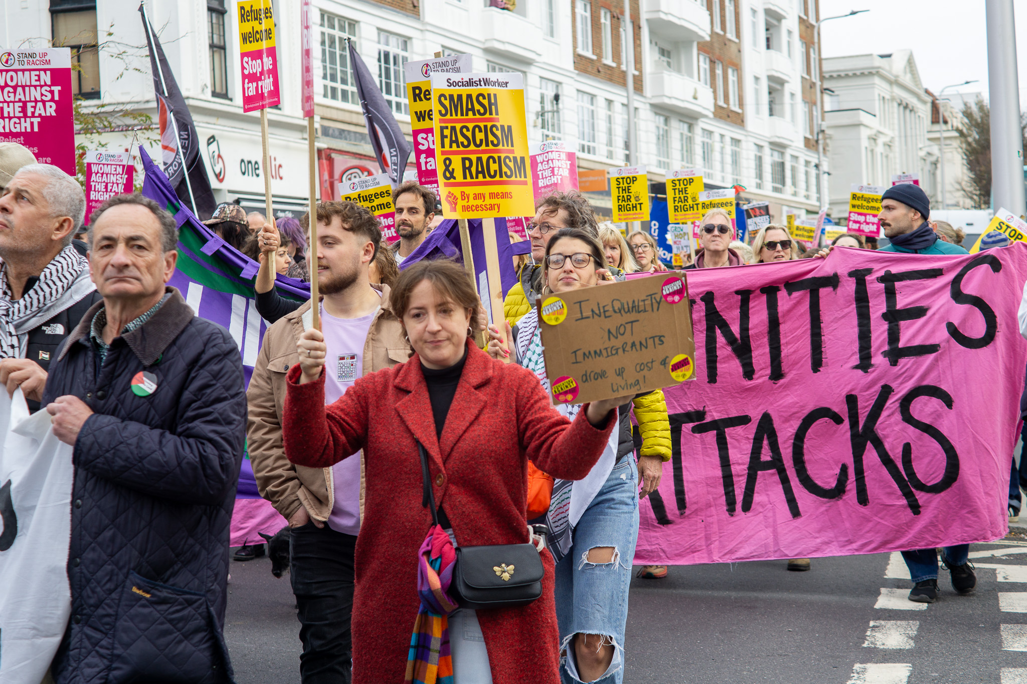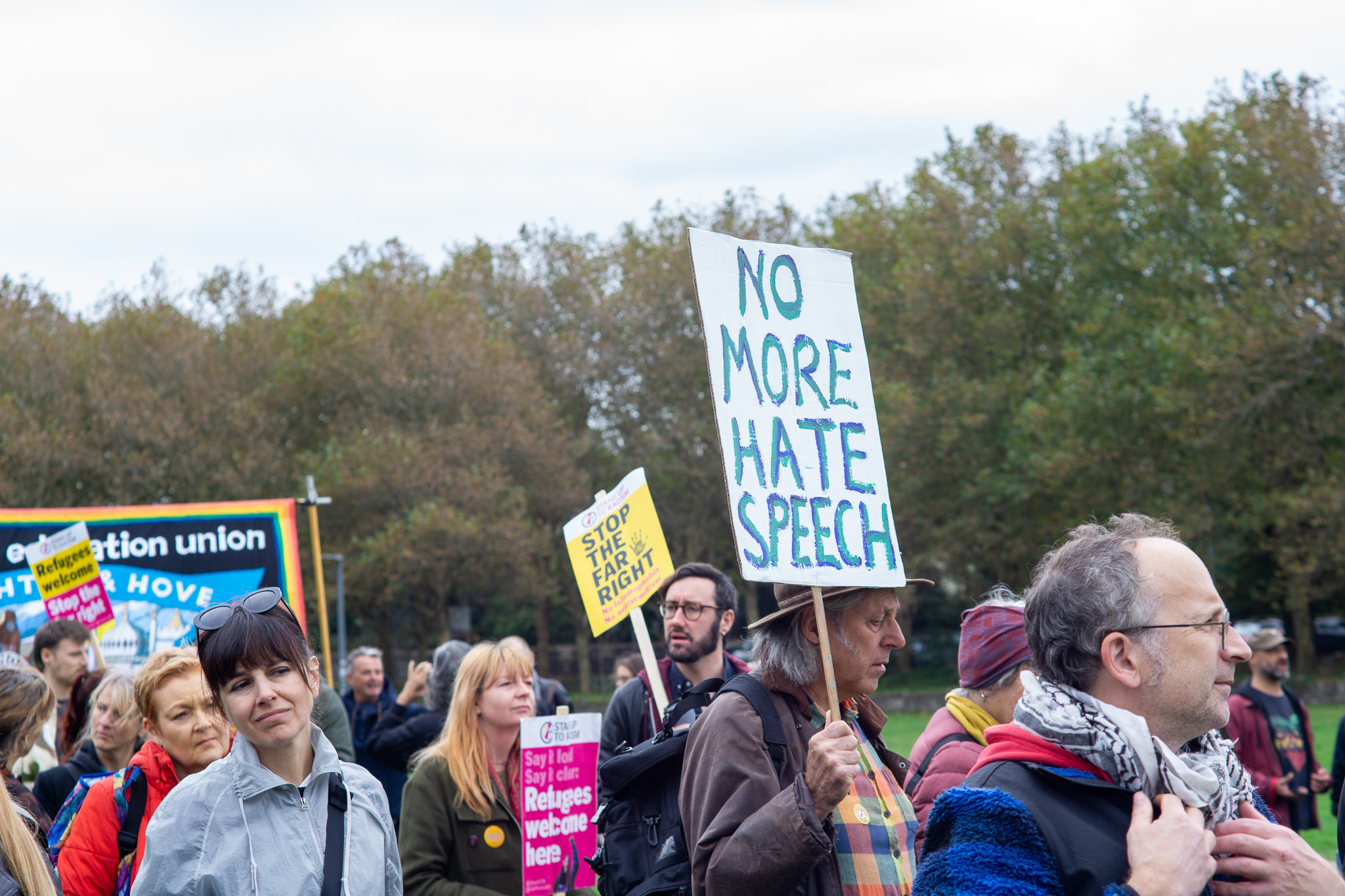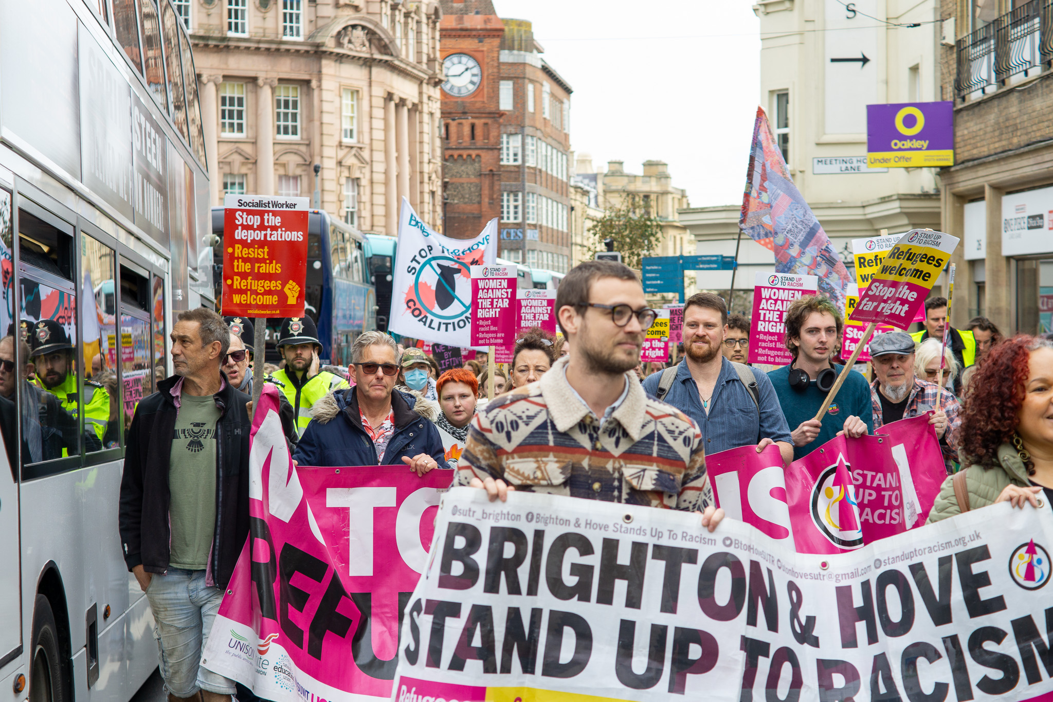 18th October, around 500 to 600 people marched through Brighton, to protest increasing racism in society. As we passed through Brighton, many were supportive. Early on in the demo, on London road, one guy at the side of the road became abusive, the police asked him to calm down, and he started a fight with them, at which point around 5 of them arrested him. After the march, we went to a cafe in Hove. Initially, upon seeing Laila’s placard the woman behind the counter was frosty with us. She asked us if we’d been on a demo. Yes, and anti racism one. Are you supportive of Palestine she asked, yes..I showed her my jumper. She immediately opened up, explaining that a bunch of pro Israel demonstrators had just been in. They’d made racist comments about Muslims, adding that she would be forced to wear a Burka. She refused to serve them and asked them to leave. When she described what they looked like, it was clear she was talking about some of Sussex Friends of Israel, who’s recent antics have included shouting in the street at Jewish people who support Palestine, and generally harassing anyone who stands agains the genocide. We ended up having a nice chat about music, and some tasty snacks.