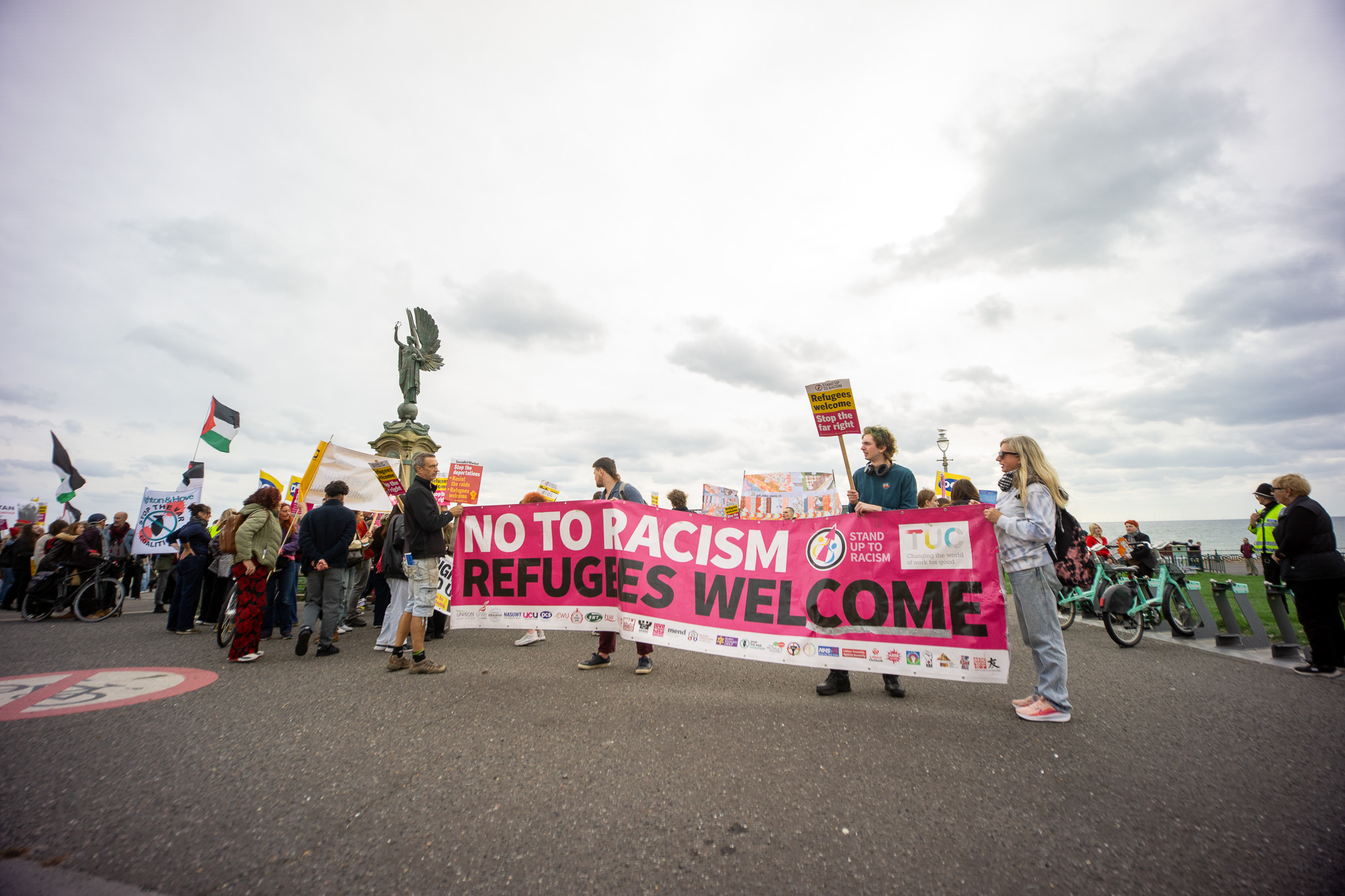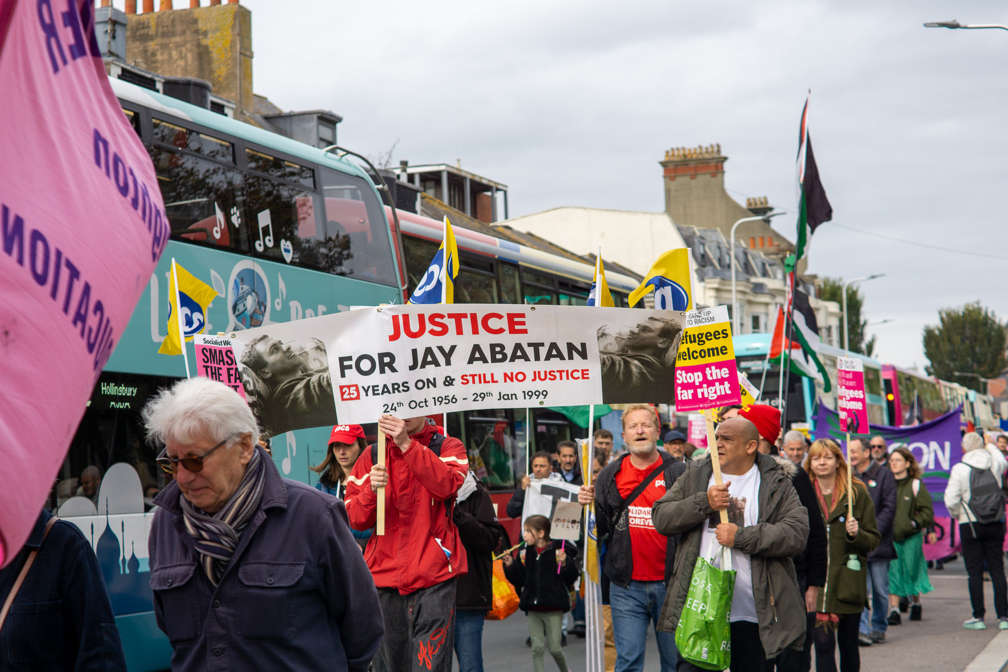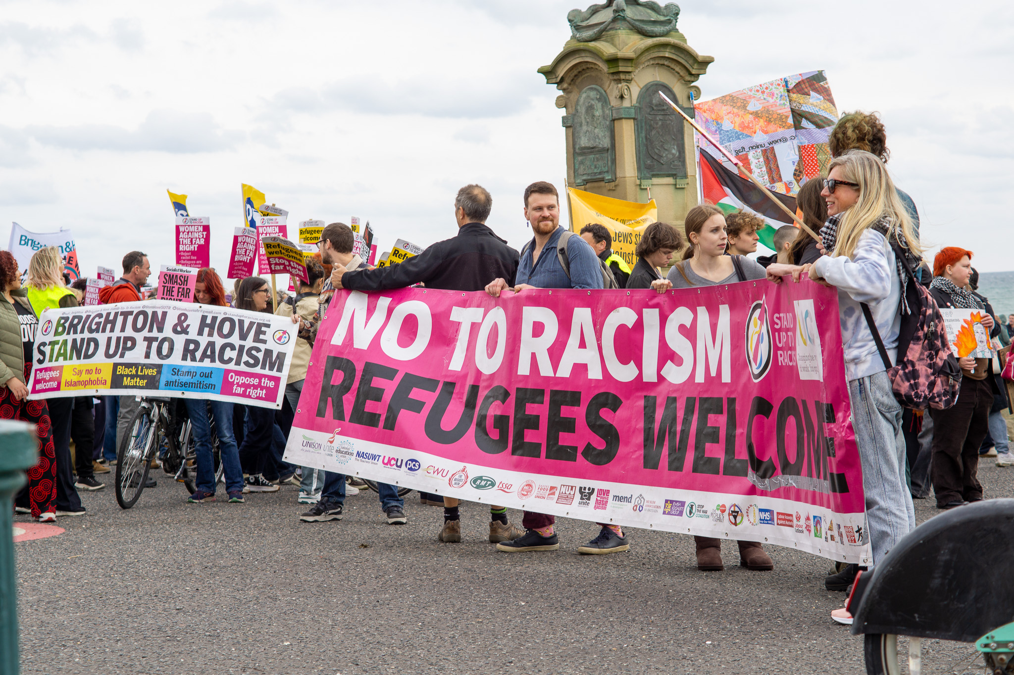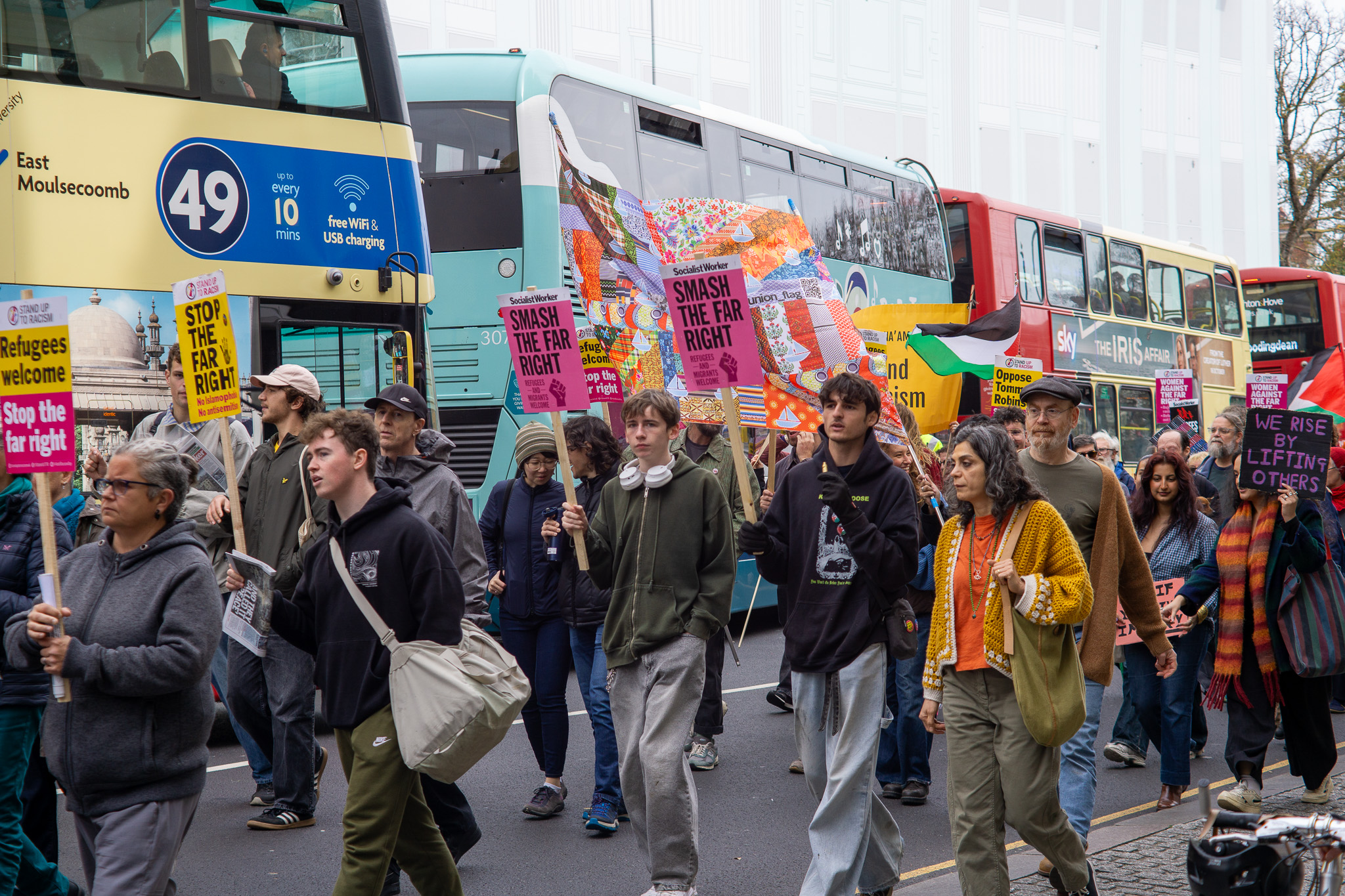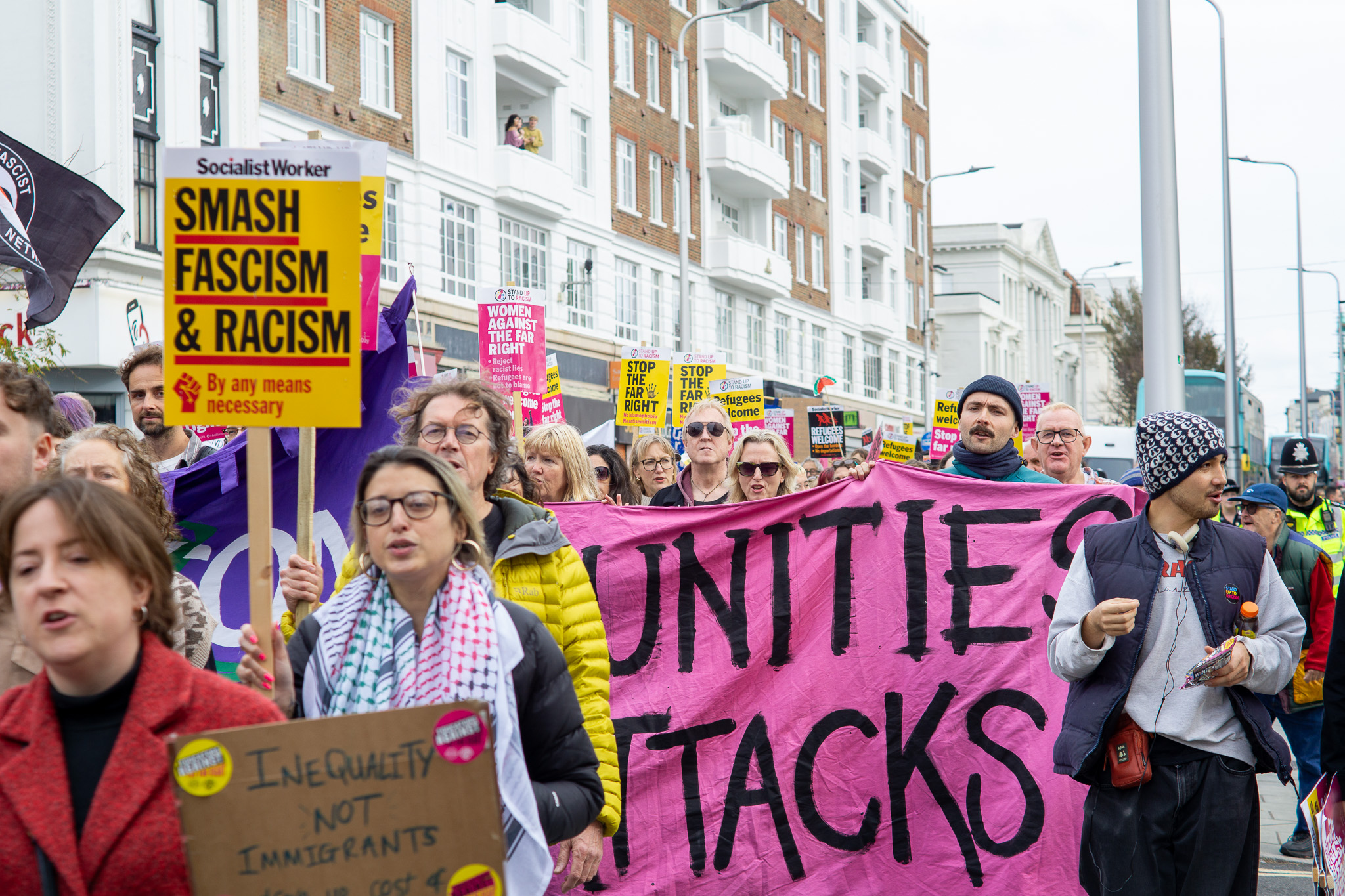 18th October, around 500 to 600 people marched through Brighton, to protest increasing racism in society. As we passed through Brighton, many were supportive. Early on in the demo, on London road, one guy at the side of the road became abusive, the police asked him to calm down, and he started a fight with them, at which point around 5 of them arrested him. After the march, we went to a cafe in Hove. Initially, upon seeing Laila’s placard the woman behind the counter was frosty with us. She asked us if we’d been on a demo. Yes, and anti racism one. Are you supportive of Palestine she asked, yes..I showed her my jumper. She immediately opened up, explaining that a bunch of pro Israel demonstrators had just been in. They’d made racist comments about Muslims, adding that she would be forced to wear a Burka. She refused to serve them and asked them to leave. When she described what they looked like, it was clear she was talking about some of Sussex Friends of Israel, who’s recent antics have included shouting in the street at Jewish people who support Palestine, and generally harassing anyone who stands agains the genocide. We ended up having a nice chat about music, and some tasty snacks.
