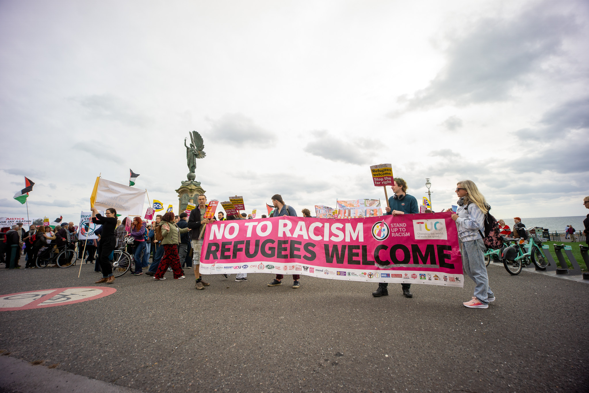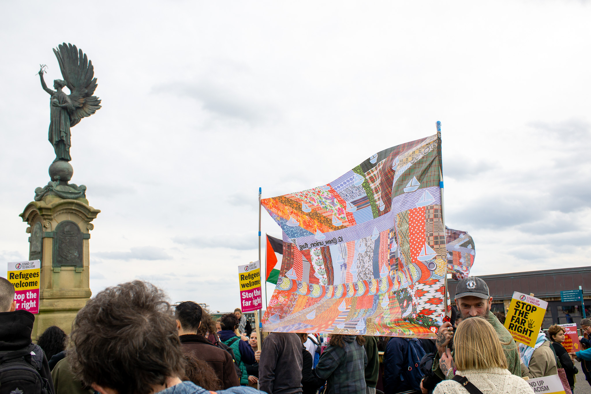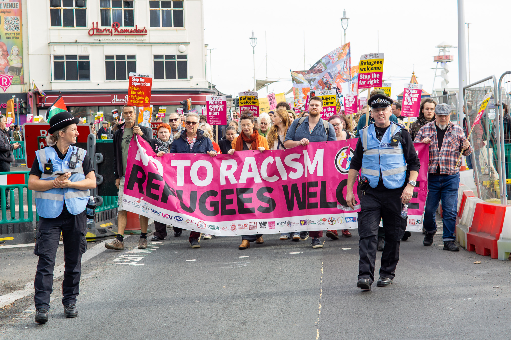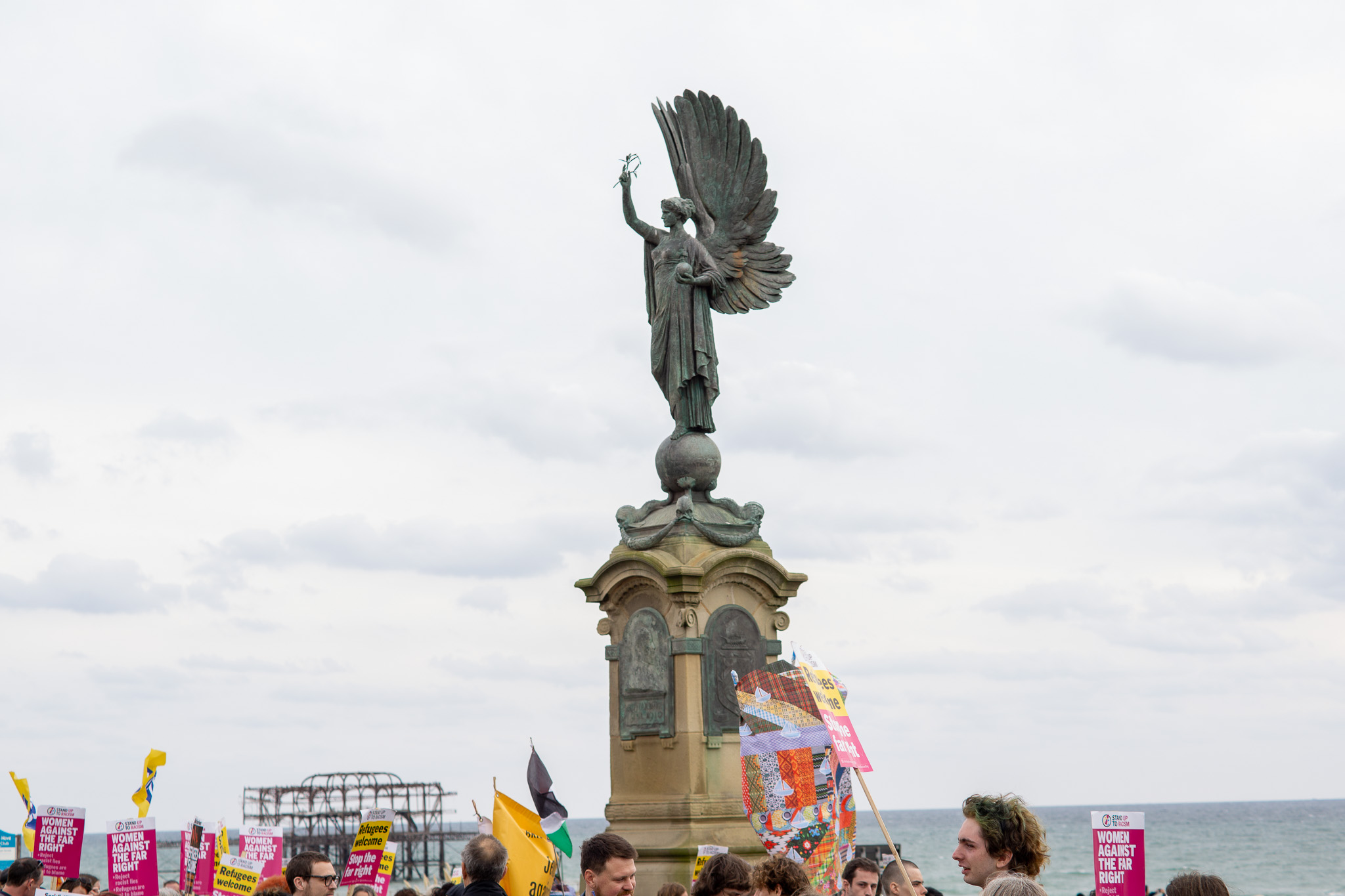 18th October, around 500 to 600 people marched through Brighton, to protest increasing racism in society. As we passed through Brighton, many were supportive. Early on in the demo, on London road, one guy at the side of the road became abusive, the police asked him to calm down, and he started a fight with them, at which point around 5 of them arrested him. After the march, we went to a cafe in Hove. Initially, upon seeing Laila’s placard the woman behind the counter was frosty with us. She asked us if we’d been on a demo. Yes, and anti racism one. Are you supportive of Palestine she asked, yes..I showed her my jumper. She immediately opened up, explaining that a bunch of pro Israel demonstrators had just been in. They’d made racist comments about Muslims, adding that she would be forced to wear a Burka. She refused to serve them and asked them to leave. When she described what they looked like, it was clear she was talking about some of Sussex Friends of Israel, who’s recent antics have included shouting in the street at Jewish people who support Palestine, and generally harassing anyone who stands agains the genocide. We ended up having a nice chat about music, and some tasty snacks.
